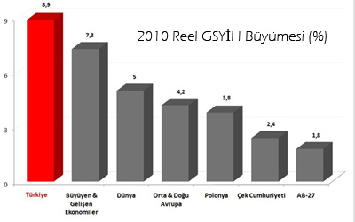 Söz konusu güçlü büyüme 2010 yılında da artarak devam etmiş, ilk çeyrekte % 12, ikinci çeyrekte % 10,3, üçüncü çeyrekte % 5,2, dördüncü çeyrekte ise % 9,2 oranında net bir büyüme kaydedilmiştir; böylece 2010 yılında kaydedilen toplam büyüme oranı % 8,9 gibi etkiliyici rakama ulaşmıştır.